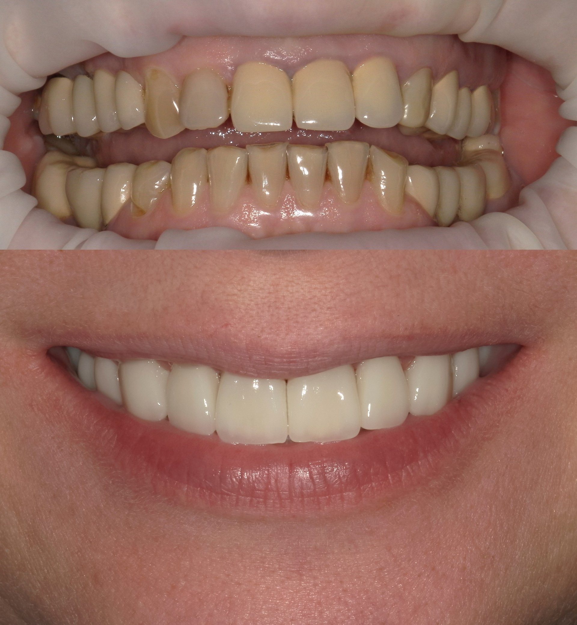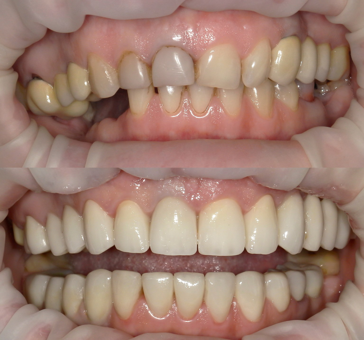 Протезирование винирами, коронками при стираемости зубов. Замена мостовидной конструкции на своих зубах на импланты.